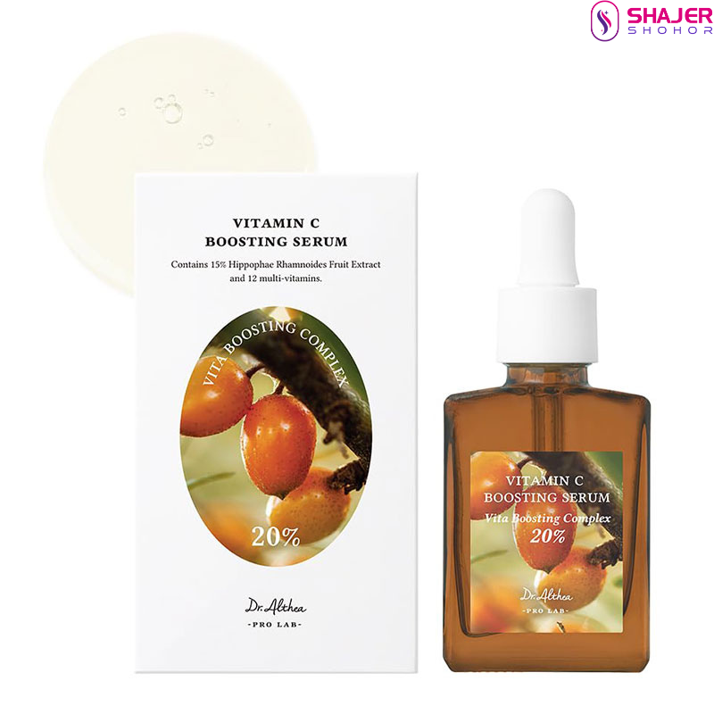 Dr. Althea Vitamin C Boosting Serum Renewed is a revitalizing serum designed to enhance skin brightness, smooth texture, and hydrate deeply. This advanced formula combines 63% Hippophae Rhamnoides (Sea Buckthorn) Water with powerful ingredients like Tranexamic Acid and Centella Asiatica Leaf Water to address dull, uneven skin tone while soothing and hydrating the skin.