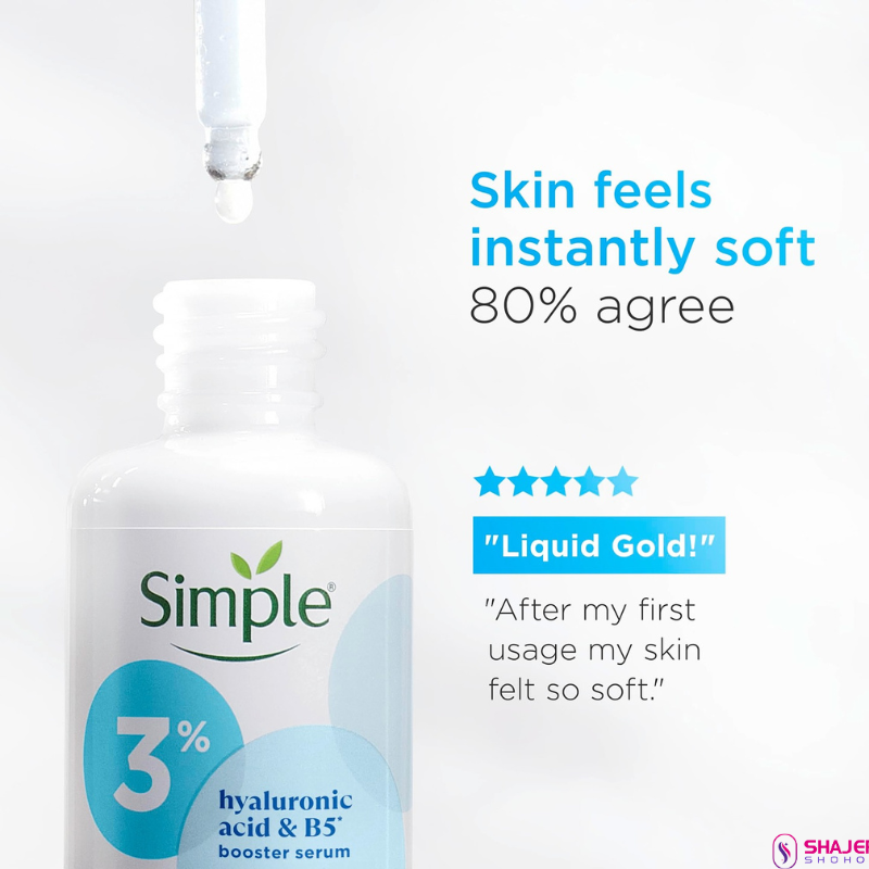 Introducing Simple Hyaluronic Acid + Vitamin B5 Booster Face Serum, our most advanced hydration innovation yet. This powerful serum delivers triple Hyaluronic Acid, Pro-Vitamin B5, and Pentavitin to provide deep hydration for up to 72 hours. The formula is designed to be potent yet gentle, ensuring maximum hydration while promoting soft, smooth, and youthful-looking skin.
