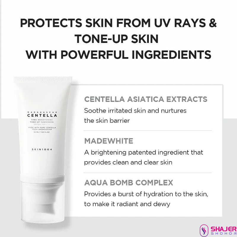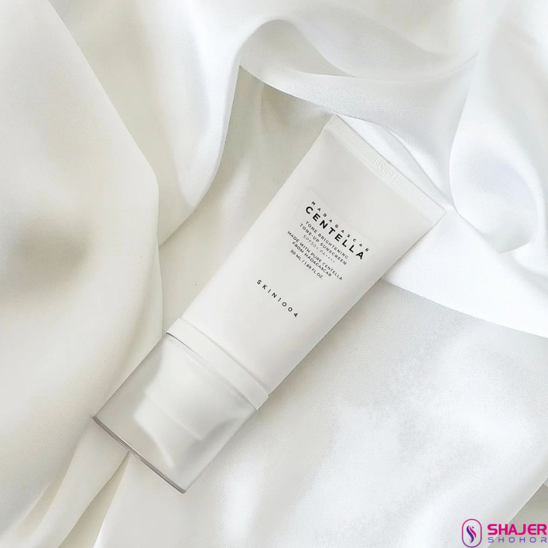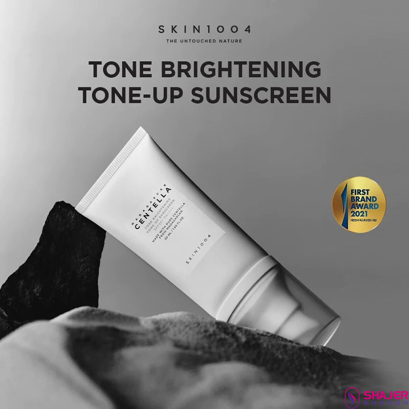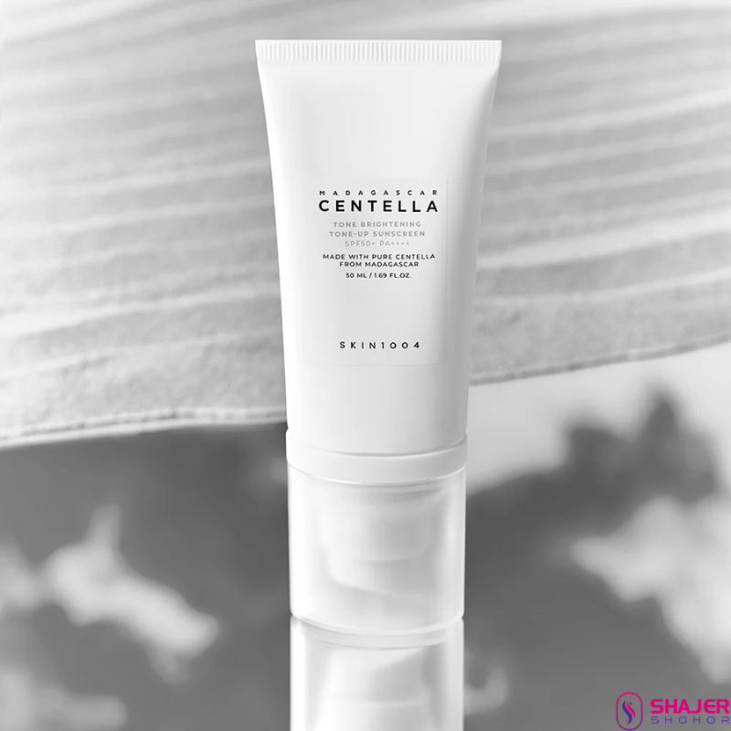 GelSKIN1004 Madagascar Centella Tone Brightening Tone-Up Sunscreen it is a lightly tinted sunscreen to give a healthy peachy pink complexion. It offers a dual action: it protects the skin from UVA and UVB rays and at the same time illuminates and revitalizes it, thanks to 4 chemical screens and one physical one.This Korean sun face cream contains anti-aging ingredients such as Niacinamide, Tranexamic Acid and Adenosine, which help prevent skin aging and improve the appearance of the skin. Furthermore, it contains Centella Asiatica extract, a plant known for its anti-inflammatory, hydrating and antioxidant properties.The formula of SKIN1004 Madagascar Centella Tone Brightening Tone-Up Sunscreen is finally enriched with Madecassoside, one of the main active compounds of Centella Asiatica which has healing, soothing and antioxidant properties.