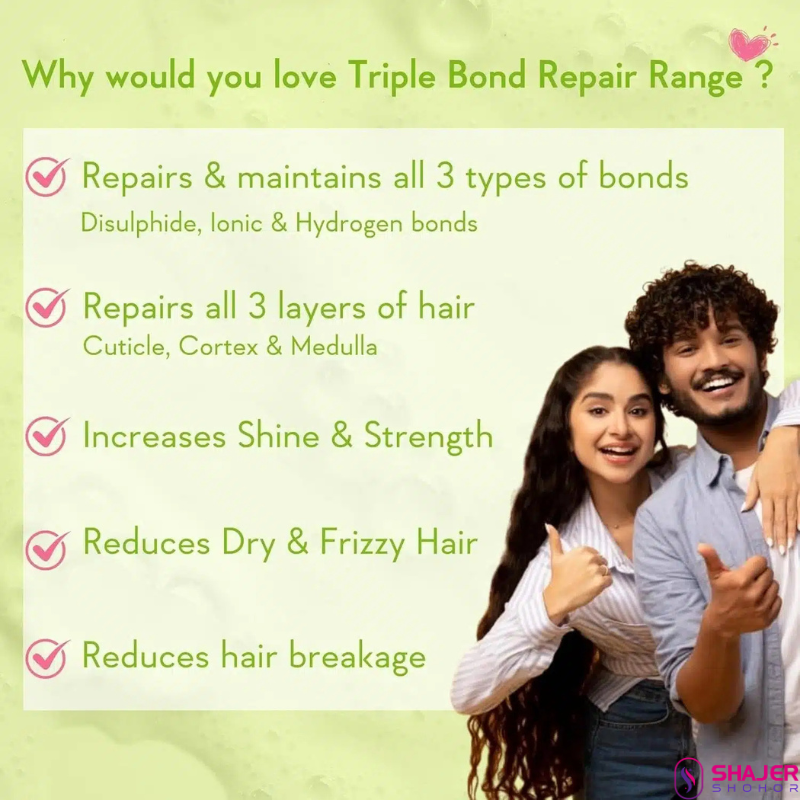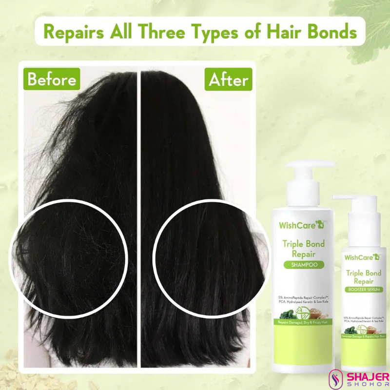 Discover the magic of healthy hair with the Wishcare Triple Bond Repair Shampoo (250ml). This hair repair shampoo rebuilds all the hair layers and bonds. It is a nourishing shampoo that makes your hair stronger and more resilient. This WishCare shampoo cleanses your hair and treats damage from bleach, hair color, or heat styling.