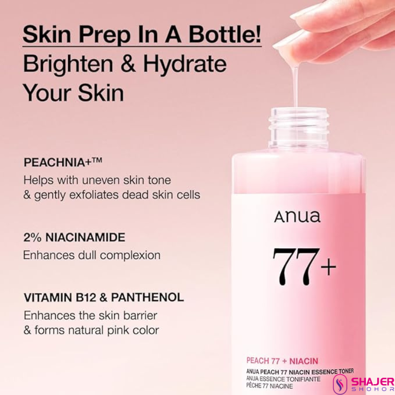 WateryAnua Peach Essence Toner formulated with 77% peach extract to leave skin looking flawless with a glowy finish. It exfoliates away dead skin cells and purifies pores for refined and radiant skin. The gentle formula is infused with niacinamide, panthenol and ceramide to moisturize and brighten skin.