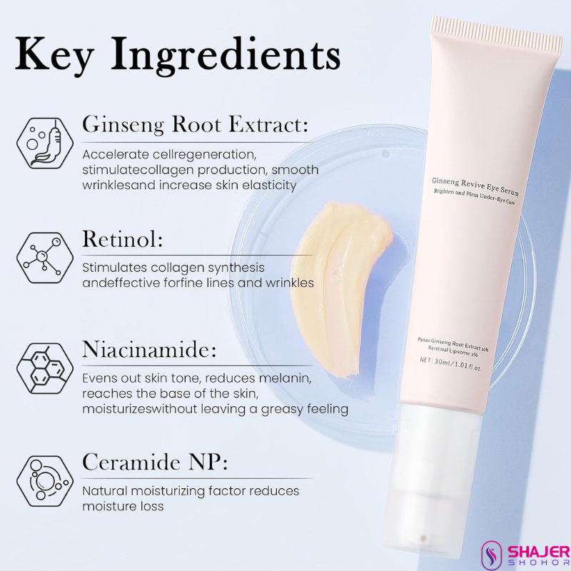 The loss of protein, which provides elasticity to our skin's dermal layer, leads to a decrease in collagen and hyaluronic acid, resulting in wrinkles. We developed an eye serum designed to mitigate these wrinkles, combining ginseng extract and retinal.Expiration Date: