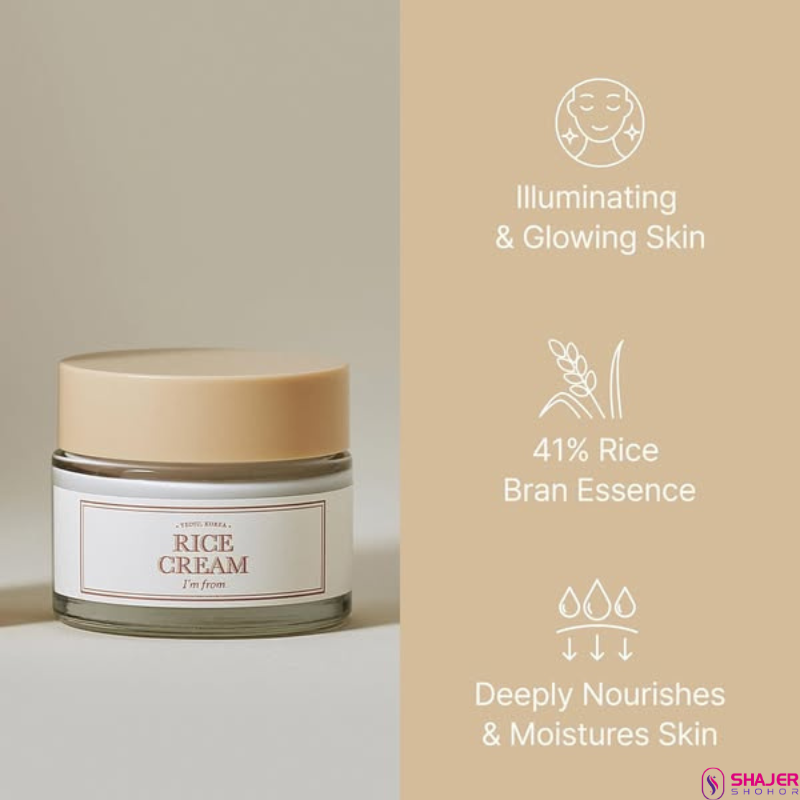 Oryza Sativa (Rice) Bran Water, Water, Glycerin, Butylene Glycol, Cetyl Ethylhexanoate, Pentaerythrityl Tetraethylhexanoate, Hydrogenated Polyisobutene, Synthetic Beeswax, Butyrospermum Parkii (Shea) Butter, Polyglyceryl-3 Methylglucose Distearate, Vinyl Dimethicone, Pentylene Glycol, 1,2-Hexanediol, Behenyl Alcohol, Glyceryl Stearate, Ammonium Acryloyldimethyltaurate/VP Copolymer, Bisabolol, Cetearyl Olivate, Panthenol, Sorbitan Olivate, Caprylyl Glycol, Ethylhexylglycerin, Xanthan Gum, Adenosine, Trisodium Ethylenediamine Disuccinate, Sodium Hyaluronate, Ceramide NP, Hydrolyzed Hyaluronic Acid, Oryza Sativa (Rice) Bran Oil, Tocopherol, Phytosphingosine, Caprylic/Capric Triglyceride, Hydrogenated LecithinI’m From Rice Cream is formulated with rice bran extract, which contains ceramides that have been distilled and specially treated to help strengthen the skin barrier. Ceramides form a protective layer that shields from sun damage and helps retain moisture. Rice also balances oil production and absorbs sebum, helping keep pores clear.