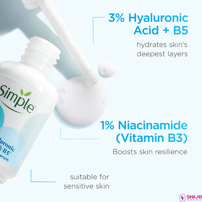 Introducing Simple Hyaluronic Acid + Vitamin B5 Booster Face Serum, our most advanced hydration innovation yet. This powerful serum delivers triple Hyaluronic Acid, Pro-Vitamin B5, and Pentavitin to provide deep hydration for up to 72 hours. The formula is designed to be potent yet gentle, ensuring maximum hydration while promoting soft, smooth, and youthful-looking skin.