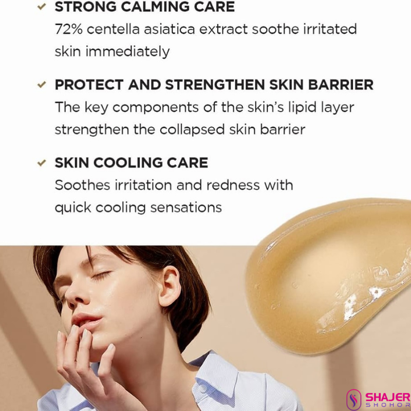 A non sticky soothing gel with Centella, Trehalose, and Ceramide NP moisturizes the skin and repairs the skin barrier.