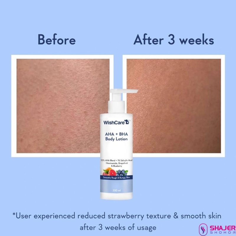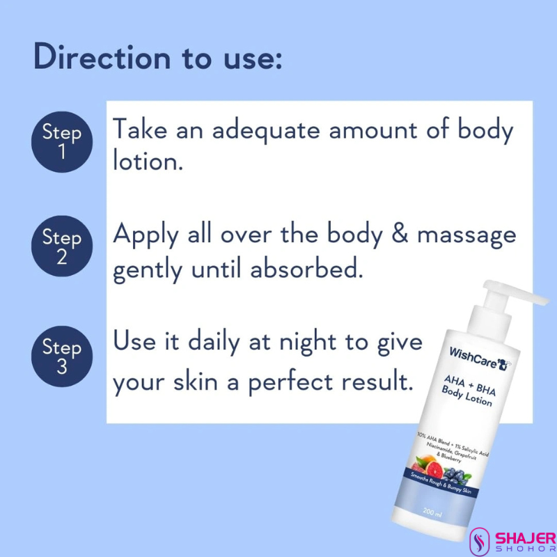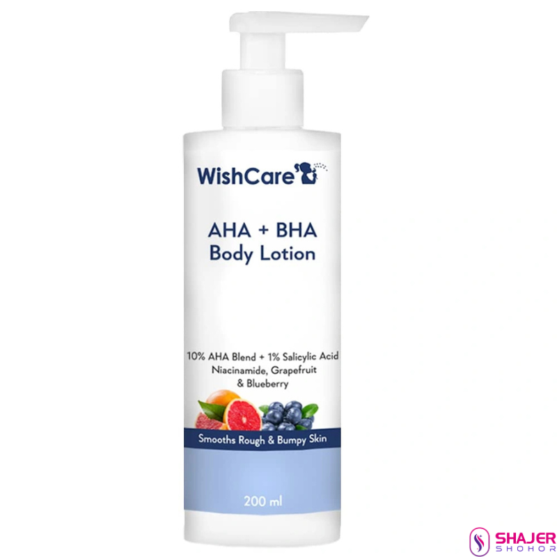 Get rid of lifeless skin with the Wishcare 10% AHA + 1% BHA Body Lotion With Niacinamide (200ml). This blueberry body lotion exfoliates your skin to remove dead skin cells. It is an anti-acne lotion that reduces the appearance of acne and bumps on your body. The WishCare body lotion is also a smoothening lotion that improves skin texture.