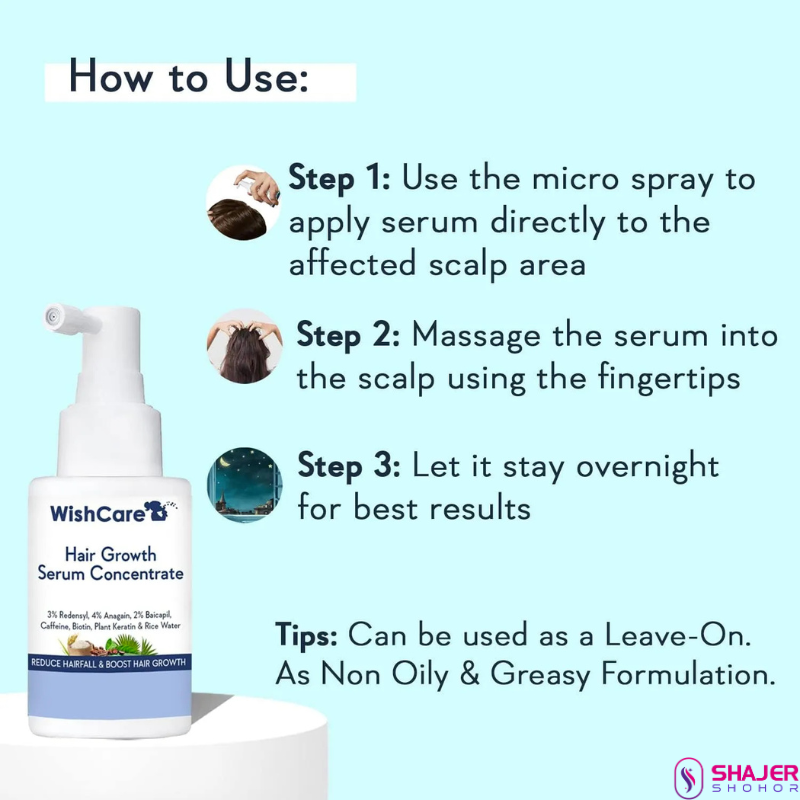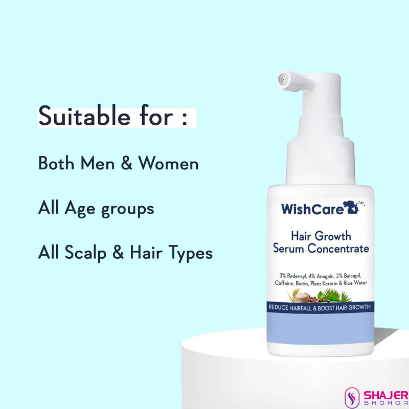 WishCare Hair Growth Serum Concentrate strengthens hair follicles, promotes healthy growth, and reduces hair fall with its nourishing blend of natural ingredients.